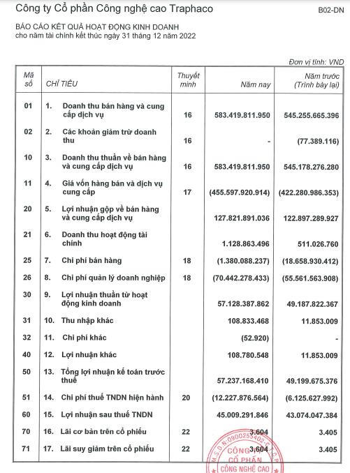 Giá vốn hàng bán ghi nhận âm 455,5 tỷ đồng, trong khi năm trước đó âm 422,2 tỷ đồng. Doanh thu hoạt động tài chính tăng vọt gấp 2 lần, lên mức 1,1 tỷ đồng. Khấu trừ chi phí, giá vốn, CNC lãi sau thuế 45 tỷ đồng, tăng 4,5% so với năm 2021.