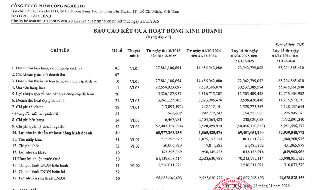 CTCP Công nghệ ITD (mã ck: ITD) vừa công bố kết quả kinh doanh quý III niên độ 01/04/2025 - 31/03/2026.