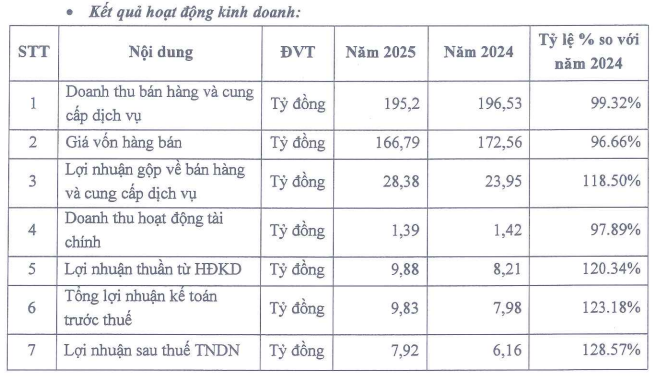 Công ty đặt kế hoạch doanh thu 196,53 tỷ đồng và lợi nhuận trước thuế 8 tỷ đồng, đi ngang về doanh thu và giảm 18% về lợi nhuận trước thuế so với thực hiện năm 2025.