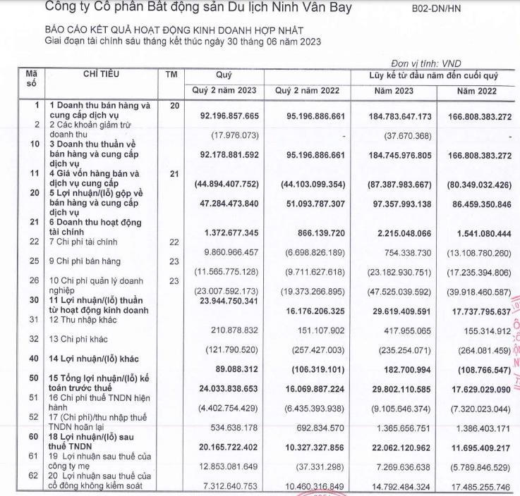 Năm 2023, Ninh Vân Bay đặt kế hoạch doanh thu hợp nhất là 383 tỷ đồng và lợi nhuận sau thuế đạt khoảng 34 tỷ đồng. Sau nửa đầu năm, công ty mới hoàn thành được 48% mục tiêu về doanh thu và 64% mục tiêu về lợi nhuận.