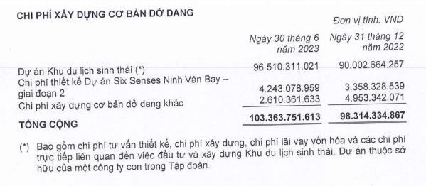 Chi phí xây dựng cơ bản dở dang tăng 5% lên mức 103,3 tỷ đồng, trong đó chiếm gần 94% là của dự án Khu du lịch sinh thái, bao gồm chi phí tư vấn thiết kế, chi phí xây dựng, chi phí lãi vay vốn hóa và chi phí trực tiếp liên quan đến việc đầu tư và xây dựng khu du lịch sinh thái.