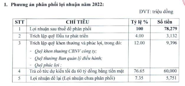 Về phương án chia cổ tức năm 2022, PMW sẽ trình cổ đông kế hoạch trả cổ tức dự kiến tối đa 60 tỷ đồng bằng tiền mặt. Năm 2023, mức chi cổ tức bằng tiền mặt dự kiến tối thiếu 10%, tương đương 1.000 đồng/cổ phiếu; trích lập quỹ khen thưởng, phúc lợi tỷ lệ 12%; trích lập quỹ đầu tư phát triển tỷ lệ 4%.
