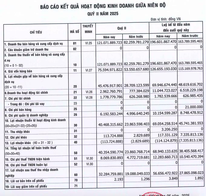 Lũy kế 6 tháng đầu năm 2025, doanh thu thuần đạt 196,6 tỷ đồng, tăng 20% so với nửa đầu năm ngoái. Lợi nhuận sau thuế đạt hơn 56,6 tỷ đồng, tăng 103,5% so với cùng kỳ năm 2024.
