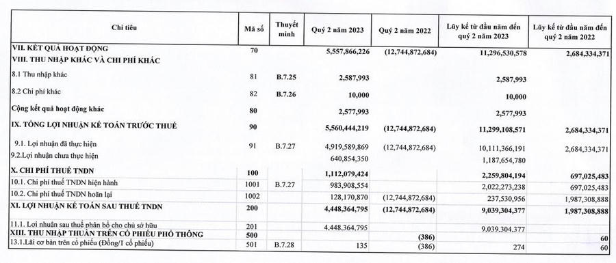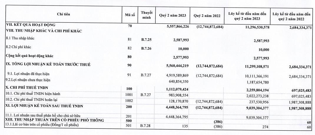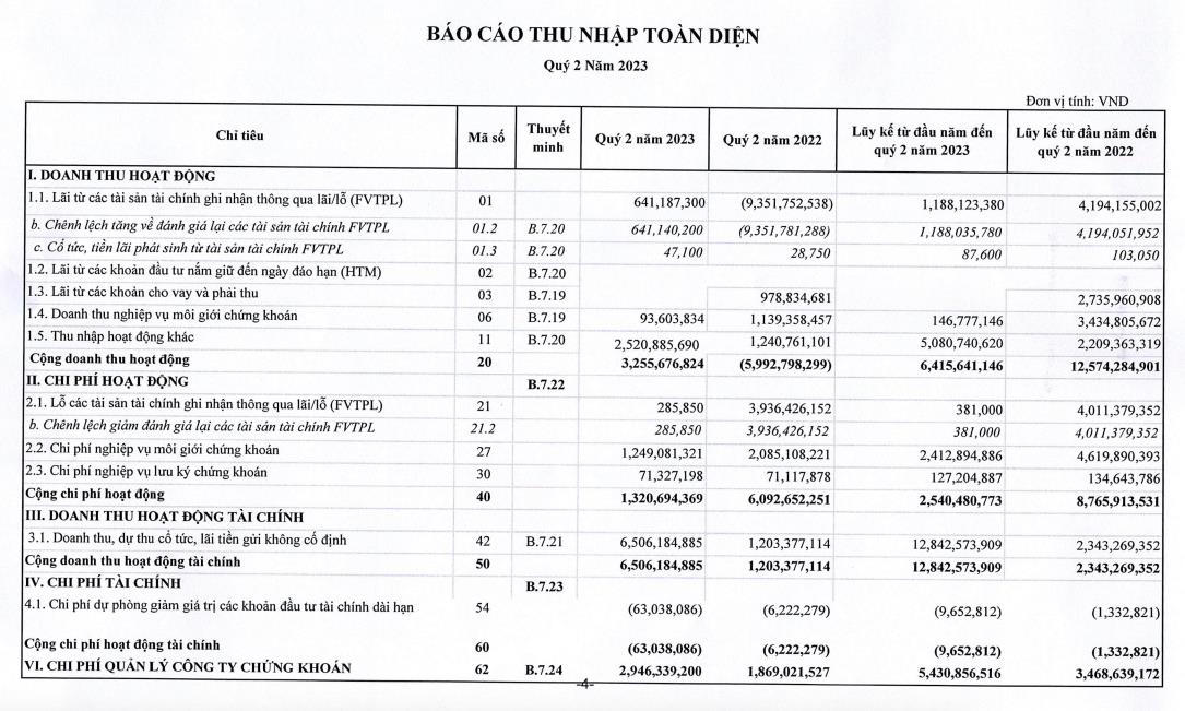 Về kết quả kinh doanh, báo cáo riêng của chứng khoán Hoà Bình quý II/2023 ghi nhận doanh thu hoạt động đạt 3,25 tỷ đồng, cải thiện đáng kể so với con số âm 5,99 tỷ đồng cùng kỳ 2022.