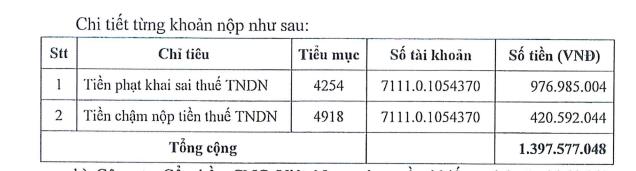Như vậy, tổng số tiền phạt và tiền chậm nộp là gần 1,4 tỷ đồng. Quyết định có hiệu lực kể từ ngày 27/12/2023.