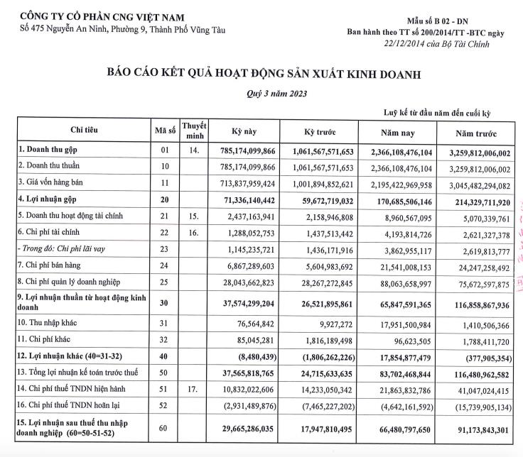 Khấu trừ giá vốn, lãi sau thuế của CNG ghi nhận đạt 66 tỷ đồng, cùng giảm 27% so với cùng kỳ.