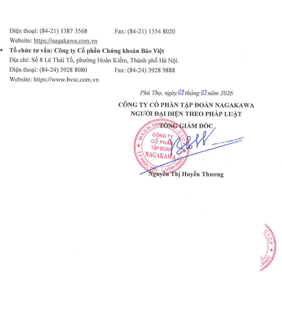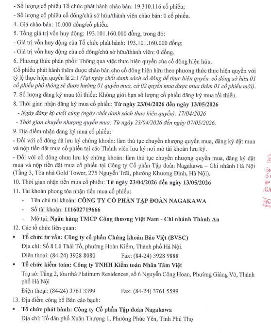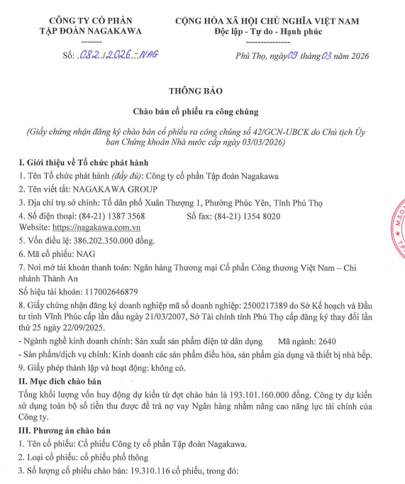 Công ty Cổ phần Tập đoàn Nagakawa (NAG) thông báo chào bán cổ phiếu ra công chúng