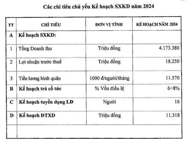 Về kết quả kinh doanh, trong năm 2024, một thành viên của Vinacomin này đặt mục tiêu tổng doanh thu đạt 4.173 tỷ đồng, Lợi nhuận trước thuế đạt 18,25 tỷ đồng, lần lượt giảm 4% và 6% so với thực hiện 2023.