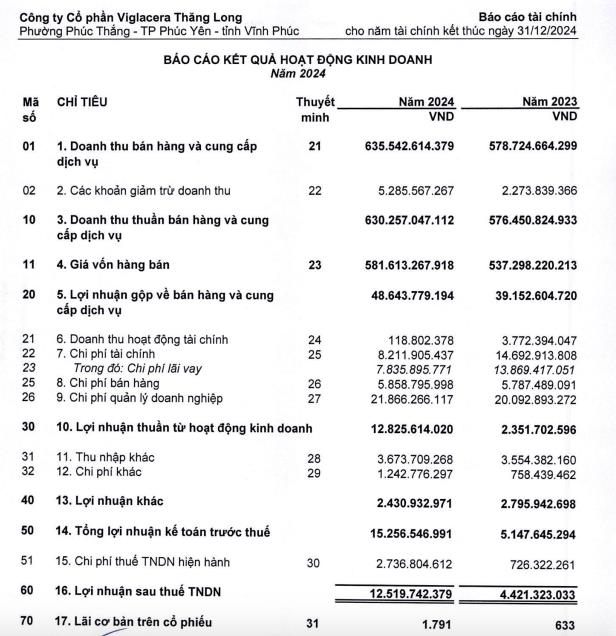 Về kết quả kinh doanh, theo báo cáo tài chính kiểm toán năm 2024, TLT ghi nhận doanh thu thuần đạt 635,5 tỷ đồng, cao hơn con số 578,7 tỷ đồng đạt được năm 2023.