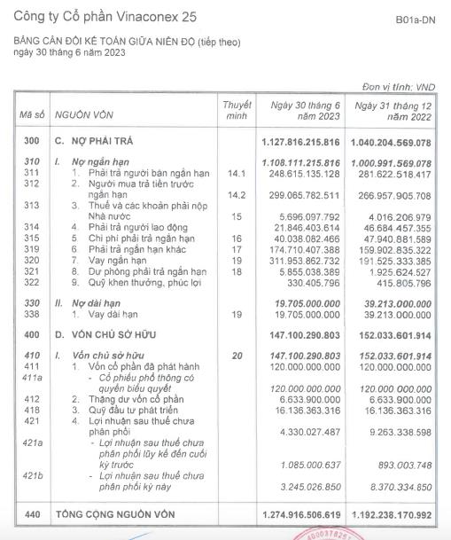 Tính đến ngày 30/6/2023, công ty Vinaconex 25 ghi nhận tổng nợ phải trả là 1.127,8 tỷ đồng, cao gấp 7,6 lần vốn chủ sở hữu.
