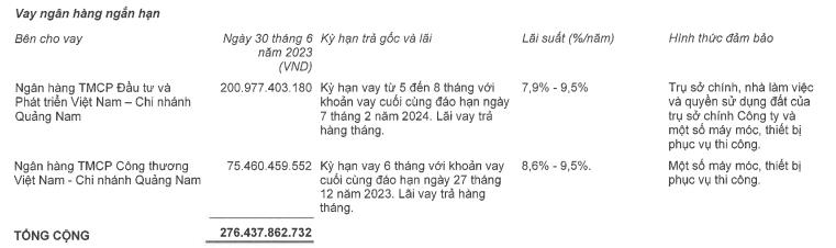 Trong đó, vay ngắn hạn tại BIDV 200,9 tỷ đồng, vay VietinBank hơn 75,4 tỷ đồng và 52 tỷ đồng còn lại là vay tín chấp từ Vinaconex. Khoản vay tại VietinBank sẽ đáo hạn vào cuối năm nay.