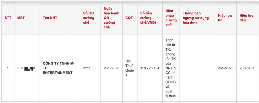 Đội Thuế quận 1 (TP HCM) đã ban hành quyết định cưỡng chế thuế đối với Công ty TNHH M-TP Entertainment với số tiền hơn 118,7 triệu đồng.