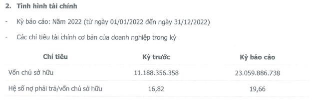 Tính đến cuối năm 2022, vốn chủ sở hữu của Hoàng Phúc Quốc tế đạt hơn 23 tỷ đồng, tăng gấp đôi so với thời điểm cuối năm 2021. Hệ số nợ phải trả trên vốn chủ sở hữu cũng tăng từ 16,68 lần lên 19,66 lần. Dư nợ trái phiếu trên vốn chủ sở hữu tăng từ 0 lên 0,48 lần.