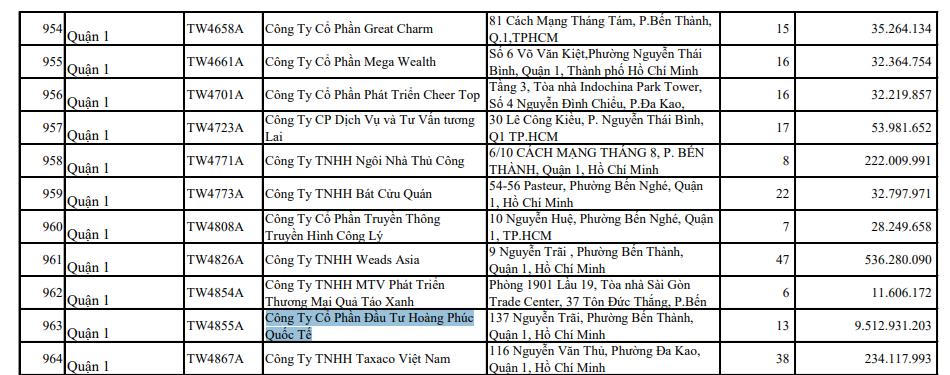 Trong đó, đáng chú ý là Công ty cổ phần Đầu tư Hoàng Phúc Quốc tế có địa chỉ tại 137 Nguyễn Trãi, phường Bến Thành, quận 1, TP Hồ Chí Minh đã nợ 13 tháng Bảo hiểm xã hội của nhân viên với tổng số tiền chậm đóng là hơn 9,5 tỷ đồng.
