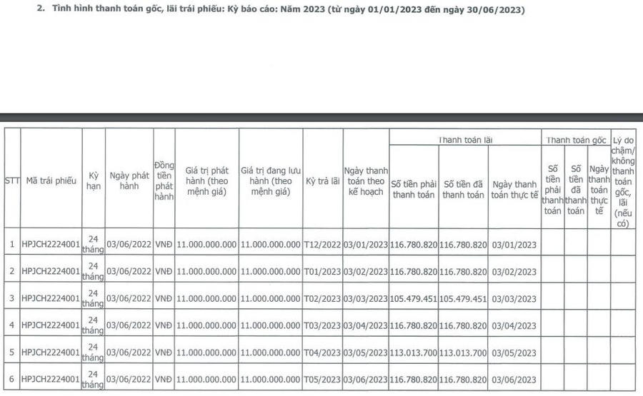 Theo HNX, tháng 6/2022, Hoàng Phúc Quốc Tế đã phát hành thành công lô trái phiếu HPJCH2224001 với trị giá 11 tỷ đồng, kỳ hạn 24 tháng. Ngày đáo hạn là 3/6/2024, lãi suất phát hành 12,5%/năm.