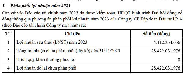 Về phân phối lợi nhuận năm 2023, Công ty IPA đề xuất không chia cổ tức và không trích lập quỹ khen thưởng phúc lợi.