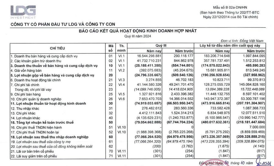 Luỹ kế trong 9 tháng đầu năm 2024, Công ty Đầu tư LDG ghi nhận doanh thu thuần âm 174,58 tỷ đồng so với cùng kỳ dương 485,5 triệu đồng. Lợi nhuận sau thuế âm 473,2 tỷ đồng trong khi cùng kỳ âm 209,3 tỷ đồng.