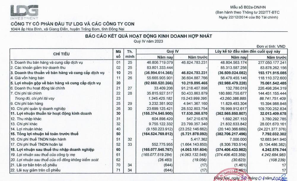 Khép lại năm 2023, Công ty Đầu tư LDG ghi nhận doanh thu đạt 36,51 tỷ đồng, giảm 81,1% so với cùng kỳ và lợi nhuận sau thuế ghi nhận lỗ 374,4 tỷ đồng so với cùng kỳ lãi 4,2 tỷ đồng.