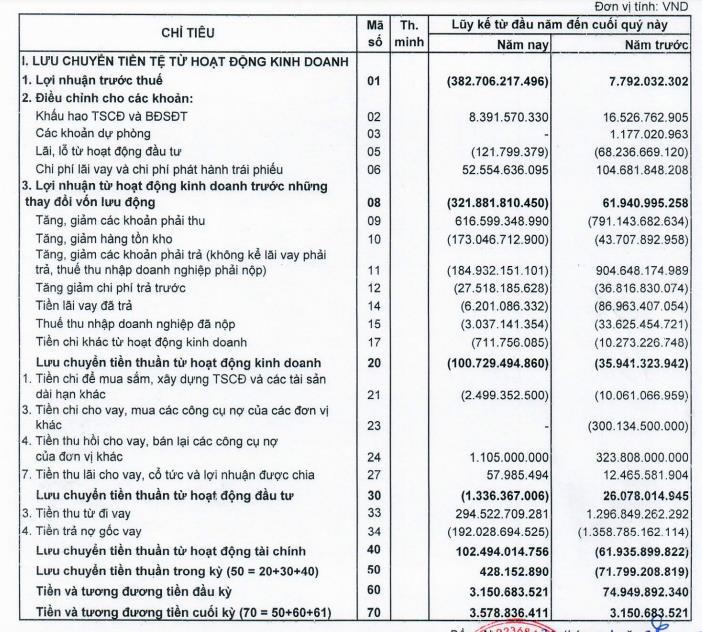 Ngoài ra, dòng tiền thuần từ hoạt động đầu tư âm 1,3 tỷ đồng và dòng tiền tài chính dương 102,5 tỷ đồng, chủ yếu tăng nợ vay để bù đắp thâm hụt dòng tiền kinh doanh.