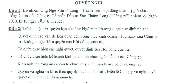 Ngày 09/06, CTCP Đầu tư Sao Thăng Long (mã ck: DST) thông báo bổ nhiệm ông Ngô Văn Phương giữ chức Tổng Giám đốc cho giai đoạn 2025 - 2030, vị trí bị khuyết từ tháng 8 năm ngoái.