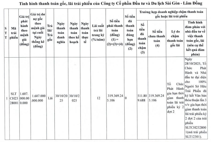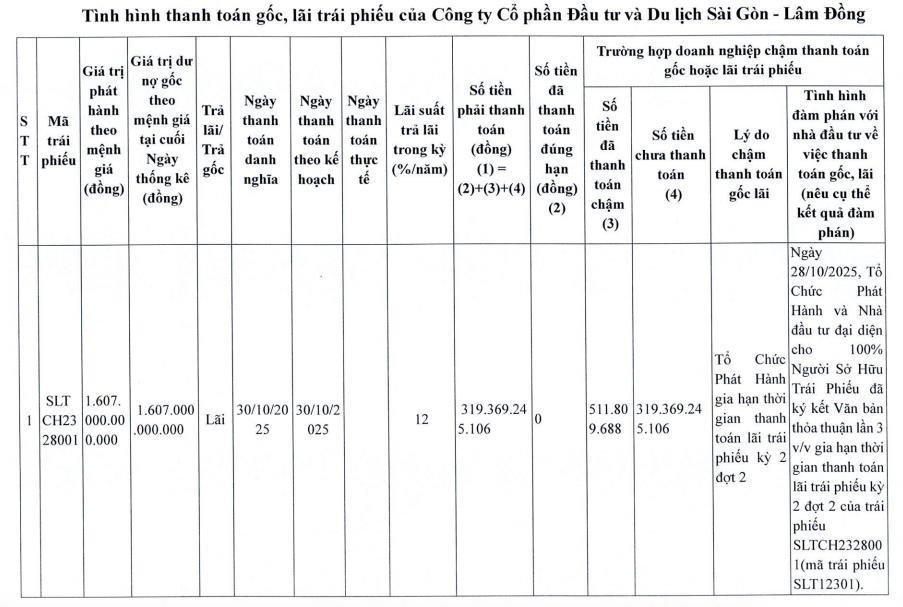 Sở Giao dịch Chứng khoán Hà Nội (HNX) cho biết, ngày 30/10/2025, Công ty Cổ phần Đầu tư và Du lịch Sài Gòn - Lâm Đồng phải thanh toán hơn 319 tỷ đồng tiền lãi cho lô trái phiếu mã SLTCH2328001. Tuy nhiên, doanh nghiệp chưa thanh toán đúng hạn do đã gia hạn thời gian thanh toán lãi trái phiếu kỳ 2 đợt 2.