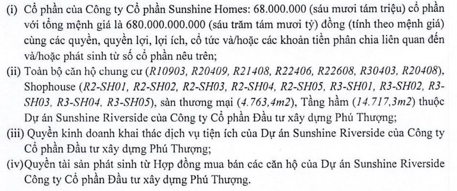 Tài sản đảm bảo là 68 triệu cổ phần của CTCP Sunshine Homes, trị giá 680 tỷ đồng tính theo mệnh giá; cùng các quyền, quyền lợi, lợi ích, cổ tức và/hoặc các khoản tiền phân chia liên quan đến và/hoặc phát sinh từ số cổ phần nêu trên; toàn bộ căn chung cư, shophouse, sàn thương mại, tầng hầm thuộc dự án Sunshine Riverside của CTCP Đầu tư xây dựng Phú Thượng, quyền khai thác dịch vụ của dự án này và quyền tài sản phát sinh từ hợp đồng mua bán các căn hộ của dự án Sunshine Riverside của CTCP Đầu tư xây dựng Phú Thượng.