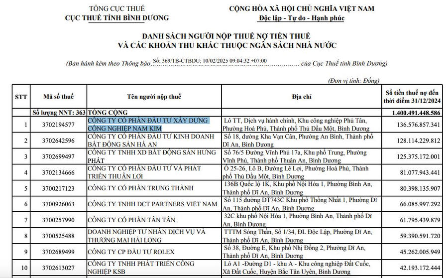 Danh sách đề cập có tổng cộng 363 người nộp thuế còn nợ tiền thuế theo thông báo ngày 10/2/2025. Đứng đầu danh sách là Công ty cổ phần Đầu tư xây dựng Công nghiệp Nam Kim với tổng số tiền nợ thuế của doanh nghiệp này là hơn 136,5 tỷ đồng.