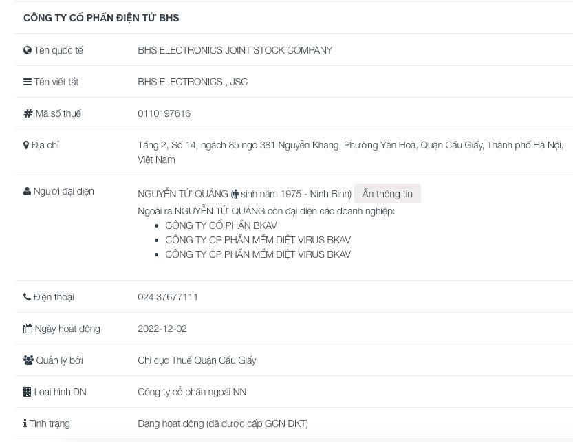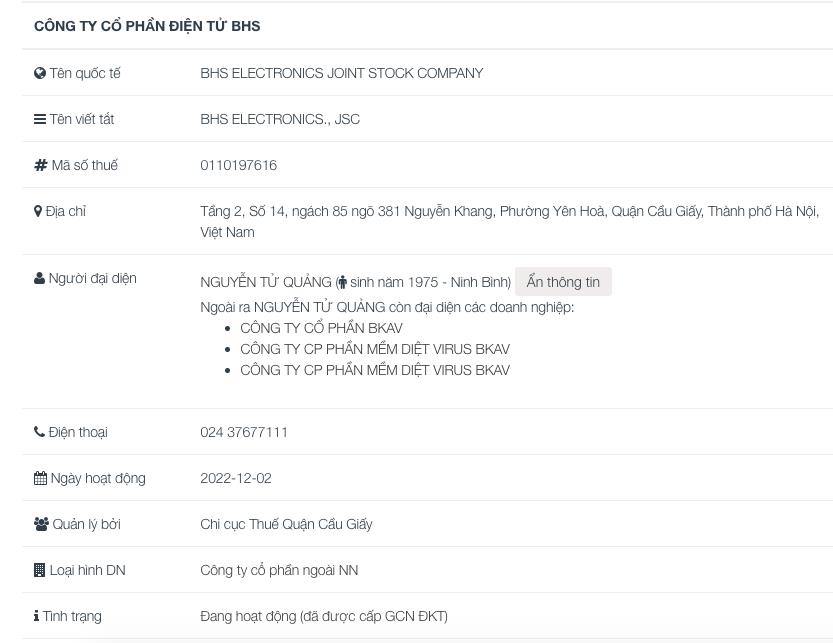 Qua tìm hiểu, theo giấy đăng ký kinh doanh, Công ty cổ phần Điện tử BHS (tên viết tắt: BHS Electronic) thành lập vào ngày 2/12/2022. Hoạt động kinh doanh chính là sản xuất thiết bị truyền thông. Vốn điều lệ ban đầu là 10 tỷ đồng, do ông Nguyễn Tử Quảng góp 98%, 2 cổ đông còn lại mỗi người góp 1%.