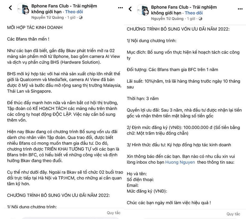 Đáng chú ý, trong bài viết của mình, ông Quảng đề cập đến chương trình bổ sung vốn ưu đãi năm 2022 dành cho nhân viên của Tập đoàn và những Bfans tham gia Bphone Fans Club trên 1 năm. Chương trình này được thực hiện nhằm bổ sung vốn kinh doanh, thực hiện kế hoạch tách công ty.