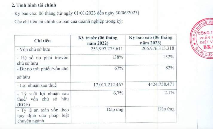 Tính đến cuối tháng 6/2023, vốn chủ sở hữu của công ty là 206,9 tỷ đồng; tỷ lệ nợ phải trả/vốn chủ sở hữu hơn 1,5 lần, tương ứng nợ phải trả gần 314.6 tỷ đồng. Tỷ lệ dư nợ trái phiếu/vốn chủ sở hữu là 82%, tương ứng dư nợ trái phiếu của Công ty hiện tại khoảng 170 tỷ đồng.