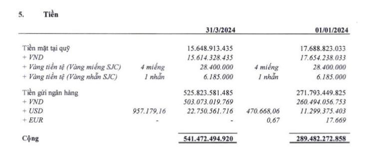 Trong đó, chiếm hơn một nửa tài sản của công ty này là lượng tiền mặt và tiền gửi ngân hàng, ở khoảng 7.300 tỷ đồng. Trong đó, QNS trữ 4 miếng vàng SJC; 1 chiếc nhẫn vàng và hơn 957,000 USD trong tài khoản. Quý 1, lãi tiền gửi, tiền cho vay đem về 66 tỷ đồng cho QNS.