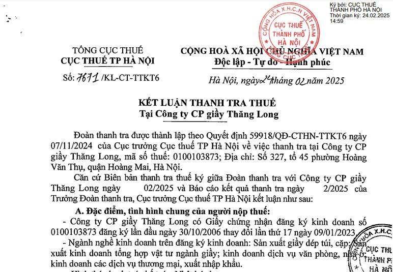 Cục Thuế thành phố Hà Nội (Tổng cục thuế) ngày 24/2/2025 ban hành kết luận thanh tra thuế với Công ty cổ phần Giầy Thăng Long, có địa chỉ tại số 327, tổ 45 phường Hoàng Văn Thụ, quận Hoàng Mai, Hà Nội.