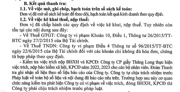 Cơ quan thanh tra cũng yêu cầu Công ty Cổ phần Giầy Thăng Long nộp đầy đủ, kịp thời số tiền thuế truy thu, truy hoàn, tiền phạt và số tiền chậm nộp vào tài khoản của cơ quan thuế khi có quyết định xử lý của cơ quan quản lý thuế.