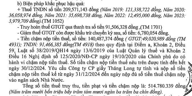 Ngoài ra, công ty phải đóng tiền chậm nộp thuế là 140,48 triệu đồng do có hành vi chậm nộp tiền thuế. Số tiền chậm nộp tiền thuế nêu trên được tính đến hết ngày 30/12/2024. Yêu cầu Công ty Cổ phần Giầy Thăng Long tự tính và nộp số tiền chậm nộp tiền thuế kể từ ngày 31/12/2024 đến ngày nộp đủ số tiền thuế chậm nộp vào ngân sách Nhà Nước.