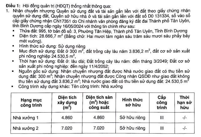 Trước đó, tại Đại hội đồng cổ đông năm 2024, lãnh đạo của GDT cũng đã nhắc đến khoản nhận chuyển nhượng này. Theo vị lãnh đạo cho biết, công ty đã tìm được một nhà máy ở phường Tân Hiệp, TP Tân Uyên, tỉnh Bình Dương, gần nhà máy 3 của Công ty. Nhà máy này đã có sẵn một hợp đồng thuê với tỷ suất lợi nhuận từ việc cho thuê ổn định khoảng 10% và sau mỗi năm có thể tăng giá thuê.