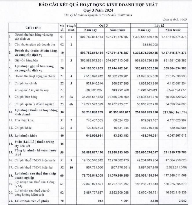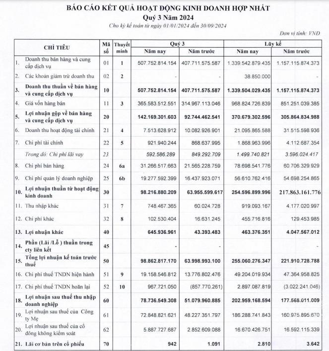 Giá vốn hàng bán tăng 16% lên mức 365 tỷ đồng nhưng đà tăng chậm hơn doanh thu giúp doanh nghiệp lãi gộp 142,1 tỷ đồng, tăng 53% so với quý III/2023.