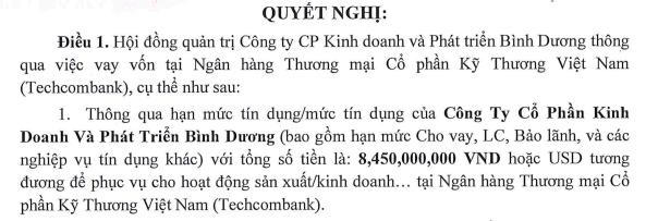 Cùng với đó, Kinh doanh và Phát triển Bình Dương cũng thông qua hạn mức tín dụng tại Ngân hàng Thương mại cổ phần Kỹ thương Việt Nam (Techcombank) với số tiền 8,45 tỷ đồng để phục vụ cho hoạt động sản xuất kinh doanh.
