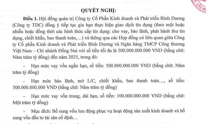 Mục đích vay tối đa 500 tỷ đồng là để TDC bổ sung vốn lưu động phục vụ hoạt động sản xuất kinh doanh và bổ sung vốn đầu tư tài sản cố định. Khoản vay sẽ có tài sản đảm bảo gồm giấy tờ có giá, bất động sản và các loại tài sản khác.