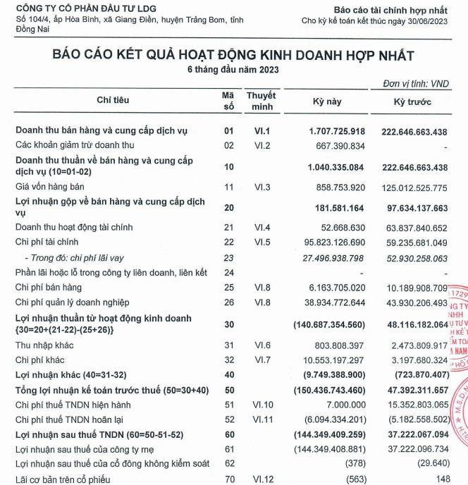 Về bức tranh tài chính, trong nửa đầu năm 2023, doanh thu thuần của LDG ghi nhận 1,04 tỷ đồng, trong khi cùng kỳ là 222,6 tỷ đồng, tương ứng giảm 99% so với cùng kỳ.