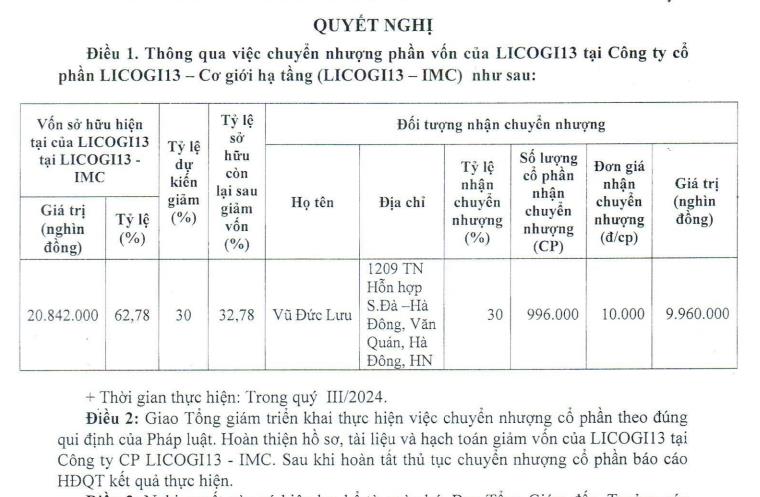 Hiện tại, LIG đang sở hữu 62,78% vốn tại Licogi13 - IMC, tương ứng hơn 20,8 tỷ đồng. Sau khi thoái bớt vốn, tỷ lệ sở hữu của LIG tại Licogi13 - IMC sẽ giảm xuống còn 32,78%. LIG giao Tổng giám đốc triển khai thực hiện việc chuyển nhượng cổ phần theo đúng quy định pháp luật.