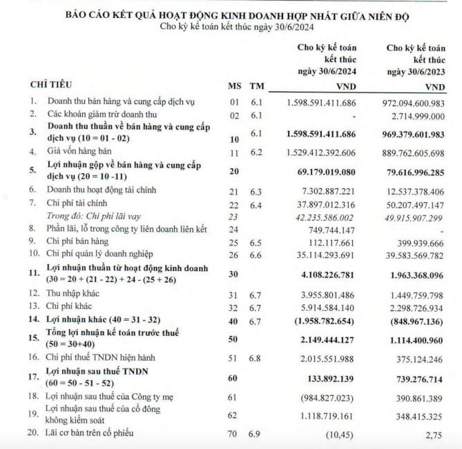 Về kết quả kinh doanh, theo báo cáo hợp nhất giữa niên độ 2024 sau soát xét, Licogi 13 ghi nhận doanh thu thuần đạt 1.598 tỷ đồng, tăng 64,9% so với cùng kỳ năm ngoái.