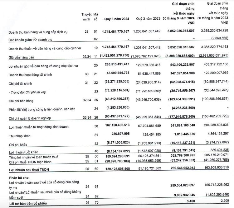 Lũy kế 9 tháng đầu năm, May Sông Hồng ghi nhận doanh thu thuần 3.852 tỷ đồng, tăng 14% so với cùng kỳ. Phần doanh thu từ hoạt động tài chính gia tăng đáng kể, chiếm 147,1 tỷ đồng, trong khi chi phí tài chính chỉ nhích nhẹ lên 62,9 tỷ. Lợi nhuận sau thuế đạt 269,5 tỷ đồng, tăng 64% so với cùng kỳ năm ngoái.