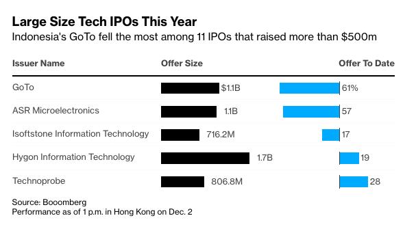 Dù đã huy động được hơn 500 triệu USD từ đợt IPO năm 2022 nhưng việc GoTo Group - công ty mẹ của ứng dụng gọi xe Gojek - chứng kiến đợt bán tháo cổ phiếu ngay sau khi IPO đã khiến công ty trở thành doanh nghiệp hoạt động kém nhất trong số 11 công ty công nghệ và internet, theo Bloomberg.