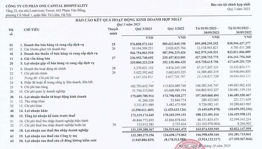 Về kết quả kinh doanh, quý III/2023, OCH ghi nhận doanh thu thuần đạt 566,7 tỷ đồng, giảm nhẹ 3,5% so với cùng kỳ.