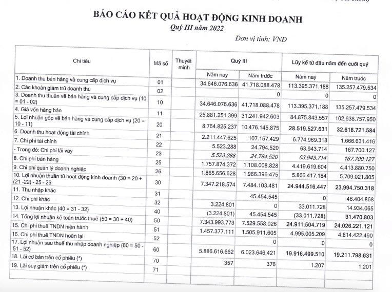 Về kết quả kinh doanh, theo báo cáo tài chính tự lập quý III/2022, công ty Minh Hưng Quảng Trị ghi nhận 34,6 tỷ đồng doanh thu thuần, giảm 17% so với cùng kỳ. Doanh thu tài chính tăng vọt gấp 20,6 lần, đạt mức 2,2 tỷ đồng. Lợi nhuận sau thuế của GMH đạt 5,8 tỷ đồng, giảm 3,3% so với cùng kỳ.
