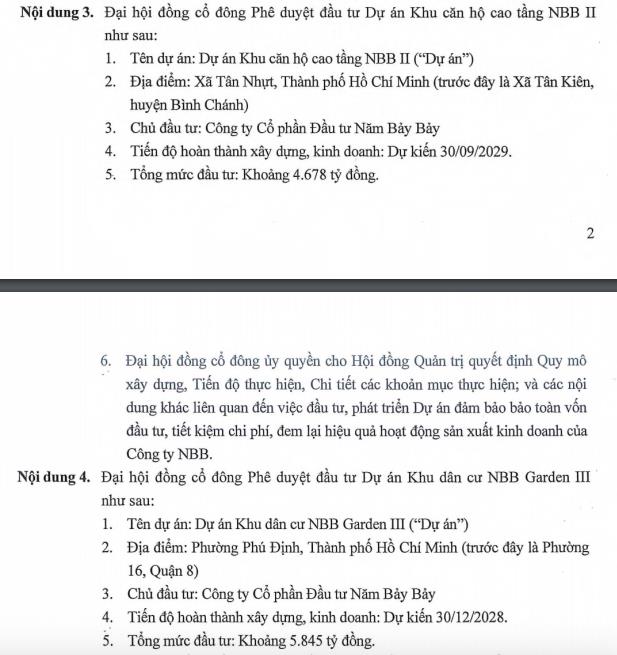 Về vấn đề đầu tư dự án, HĐQT Năm Bảy Bảy trình cổ đông 2 dự án. Thứ nhất là khu căn hộ cao tầng NBB II tại xã Tân Nhựt, TP HCM (trước đây là xã Tân Kiên, huyện Bình Chánh). Tổng mức đầu tư dự án khoảng 4.678 tỷ đồng, dự kiến hoàn thành vào 30/9/2029.