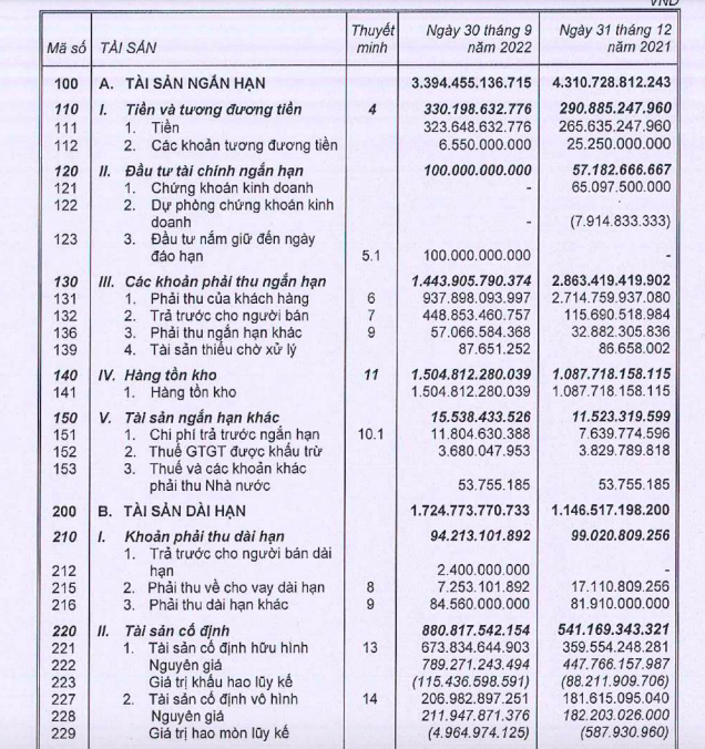 Tính tới ngày 30/9/2022, tổng tài sản của BAF Việt Nam giảm 6,2% xuống 5.199 tỷ đồng. Trong đó, tài sản ngắn hạn chiếm 66% với 3.394 tỷ đồng; trữ tiền tăng 13,5% lên 330,2 tỷ đồng; hàng tồn kho tăng 38,3% lên 1.505 tỷ đồng.