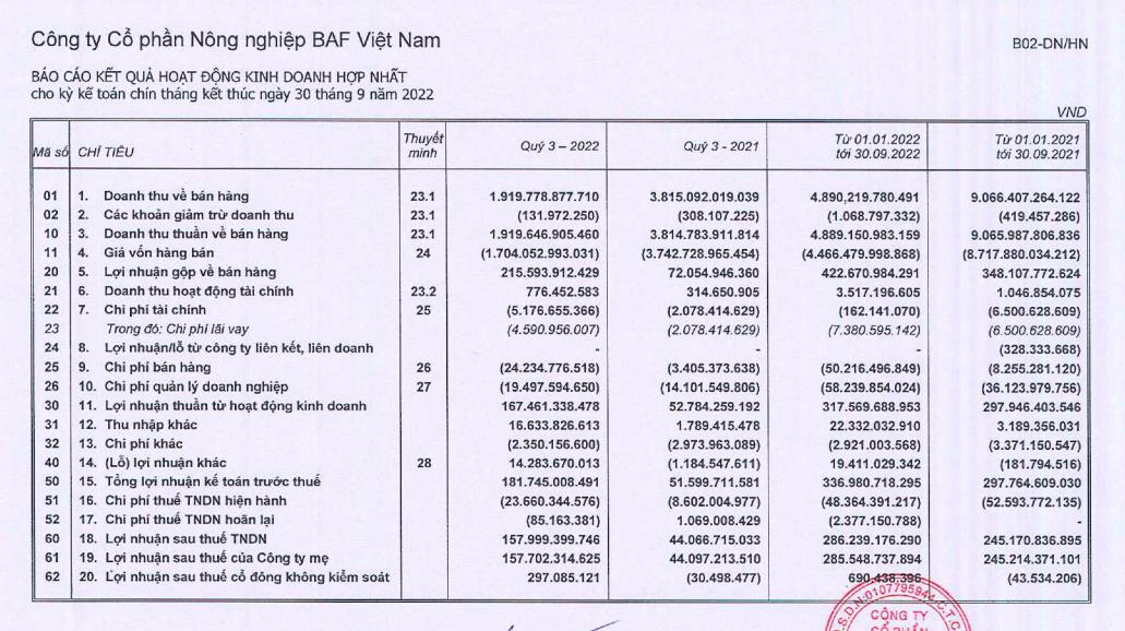 Công ty cổ phần Nông nghiệp BAF Việt Nam (mã CK: BAF) vừa công bố kết quả kinh doanh quý III với doanh thu thuần đạt 1.919,6 tỷ đồng, giảm 50% so với cùng kỳ. Tuy nhiên, tốc độ giá vốn giảm mạnh giúp lợi nhuận gộp đạt 216 tỷ đồng, gấp 3 lần quý III/2021.