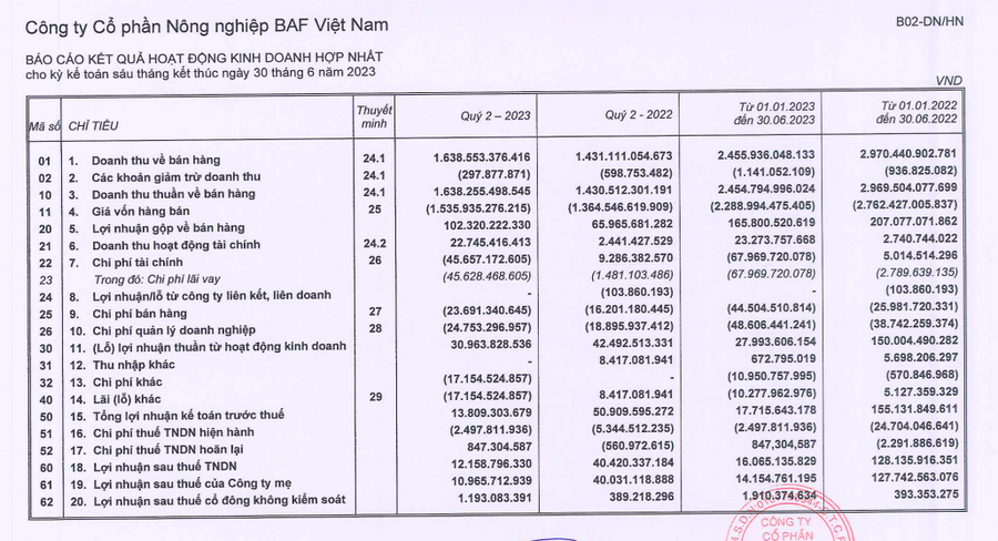 Luỹ kế trong 6 tháng đầu năm 2023, BaF Việt Nam ghi nhận doanh thu đạt 2.454,7 tỷ đồng, giảm 17,3% so với cùng kỳ và lợi nhuận sau thuế ghi nhận 16,05 tỷ đồng, giảm 87,5% so với cùng kỳ.
