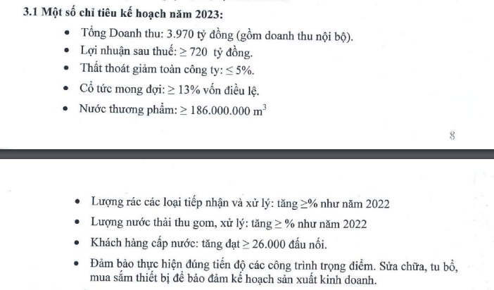 Năm 2023, Biwase đặt mục tiêu doanh thu 3.970 tỷ đồng, lợi nhuận sau thuế ít nhất 720 tỷ, lần lượt giảm 14% và giảm 3% so với kết quả kiểm toán năm ngoái. Công ty dự kiến tỷ lệ cổ tức ít nhất là 13% vốn điều lệ cho năm 2023.
